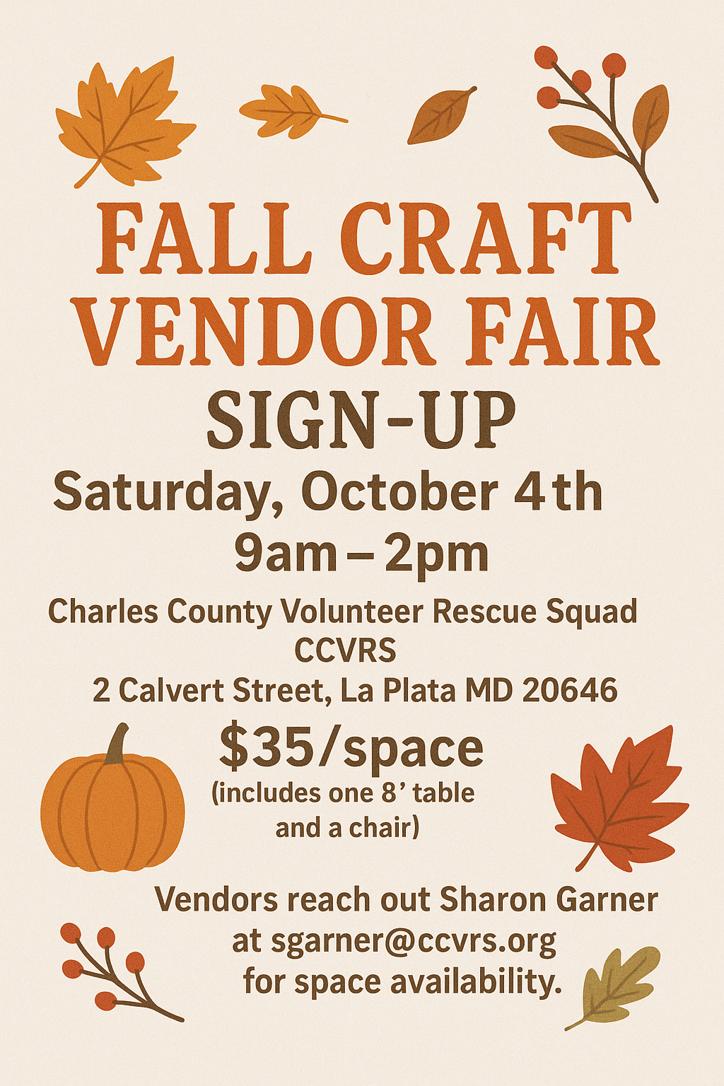 We’re excited to announce the Fall Craft Vendor Fair hosted by the Charles County Volunteer Rescue Squad (CCVRS)!