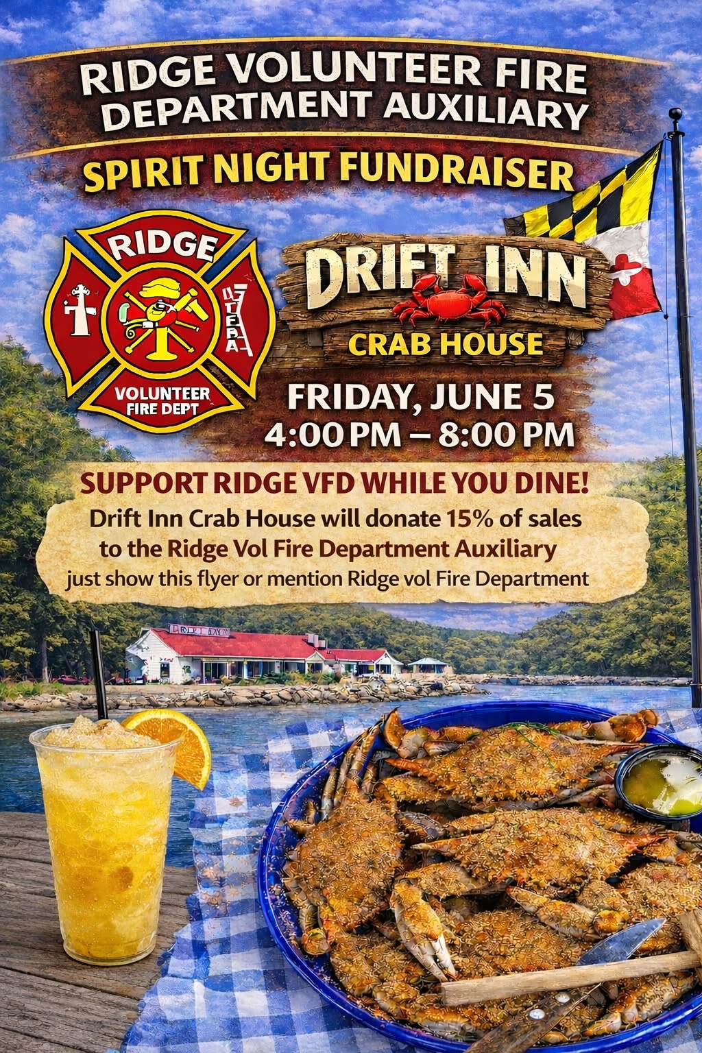 Join us for a Spirit Night Fundraiser to benefit the Ridge Volunteer Fire Department Auxiliary!